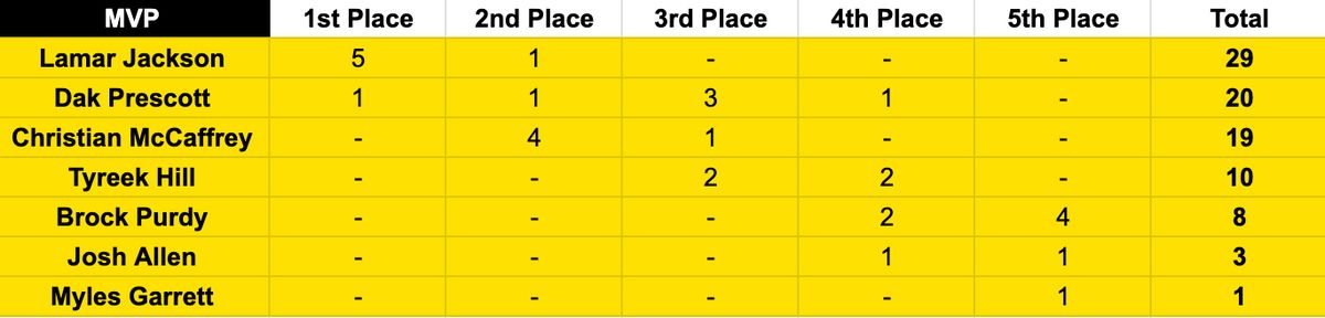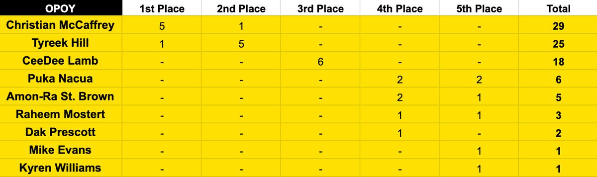 While CeeDee Lamb made a strong push, this was a two-horse race for most of the season. Christian McCaffrey and Tyreek Hill had all-time seasons at their respective positions, and either is a deserving option to win this award. However, the TDN staff clearly favors McCaffrey for his touchdown scoring and overall importance to the 49ers' offense.