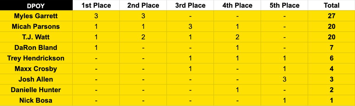 What a phenomenal race this has been. Myles Garrett, Micah Parsons, T.J. Watt, and DaRon Bland have all gotten some national love for this award. In the end, the pass rushers won out and Myles Garrett took home the award from the TDN staff. He was first or second on every ballot.