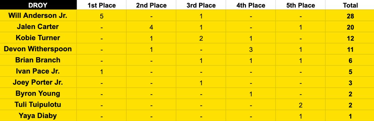 This one may surprise some, as Jalen Carter has been the betting favorite all season long to win the award. However, Will Anderson Jr. has been a monster for the AFC South-winning Houston Texans despite facing a high volume of double teams. Kobie Turner made a very strong late push for the award, while DBs like Devon Witherspoon and Brian Branch have been playmakers all season long.