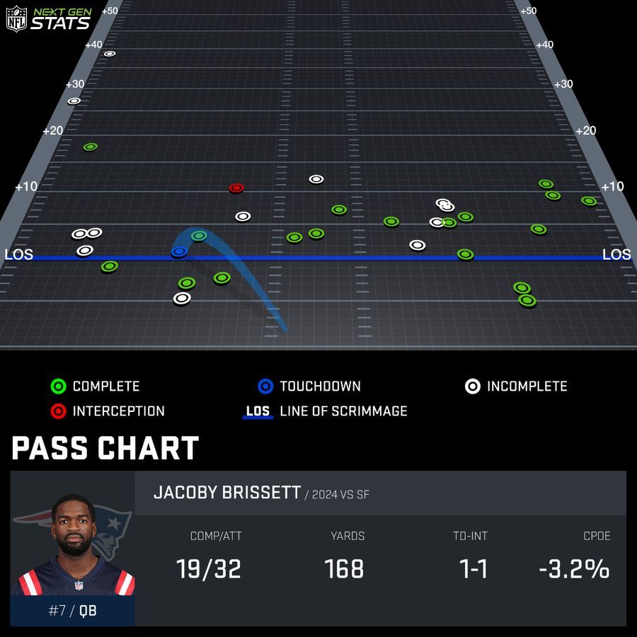 As their franchise quarterback, Maye is certainly the key to this rebuild. The organization has every incentive to do what they think is best for his development, and, for now, that has meant starting veteran Jacoby Brissett over him. That being said, the calls for Maye to take over will only get louder moving forward. Only Bo Nix and Deshaun Watson are averaging fewer passing yards per attempt than Brissett (5.3), and it doesn’t help that he’s also been sacked 15 times already. Meanwhile, the team’s passing offense has been quite limited with very little production to be had down the field.
