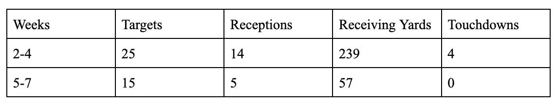 Immediately, Arizona’s faith in Harrison Jr. appeared to be paying dividends. Although he was held to just one catch and four receiving yards in his NFL debut, he followed that up by catching four touchdowns over the next three weeks. The highlight performance came in Week 2, where he managed to generate 130 receiving yards and two touchdowns on just four catches.