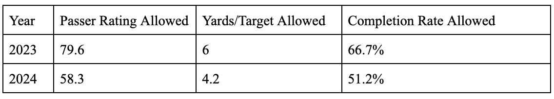 Appearing in nine games as a rookie, Williams performed admirably. He played between 64% and 90% of the defense’s snaps in a five-game span before seeing his season cut prematurely due to injury. He allowed just a 79.6 passer rating and only six passing yards per target. Those are very impressive numbers, let alone for a rookie cornerback on a struggling defense, but he has taken his game to a completely different threshold this season.