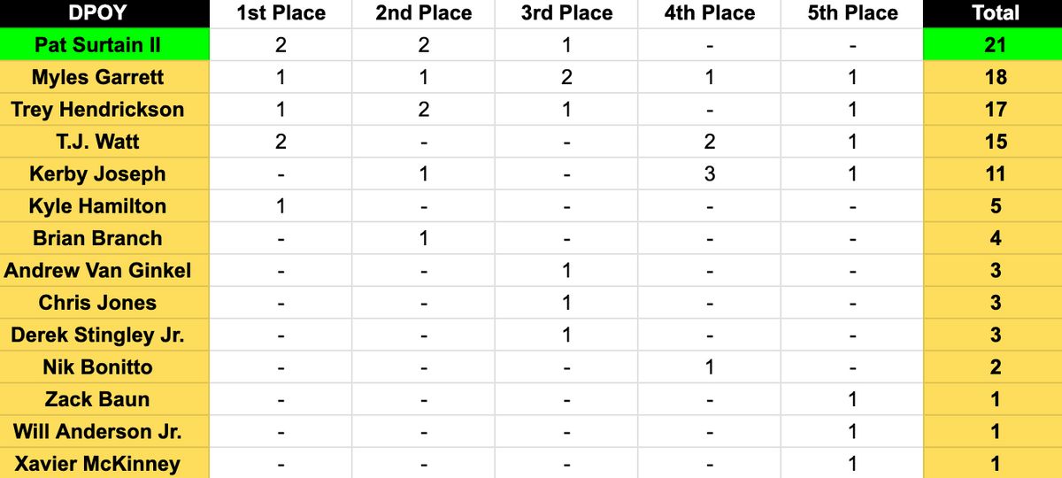 This was a fascinating race for NFL Defensive Player of the Year. No player appeared on all seven ballots and five different players received a first-place vote. In the end, Broncos cornerback Patrick Surtain II takes home the award after a lockdown season on the outside of Denver's defense. Trey Hendrickson made a late-season run to pass Myles Garrett for the NFL sack lead, but Garrett just snuck by Hendrickson for the No. 2 spot.