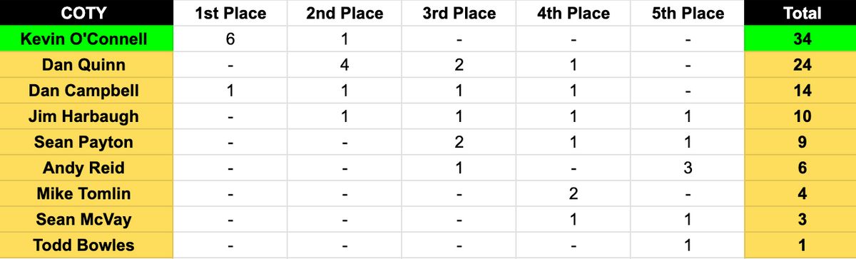 Despite dropping the season finale on Sunday Night Football, Vikings head coach Kevin O'Connell was nearly a unanimous choice for NFL Coach of the Year. Minnesota won 14 games and saw Sam Darnold become an MVP candidate. Dan Quinn has guided a culture shift in Washington with a rookie quarterback. Dan Campbell navigated a slew of injuries to will his team to the No. 1 team in the NFC. Jim Harbaugh and Sean Payton led their AFC West squads to the postseason.