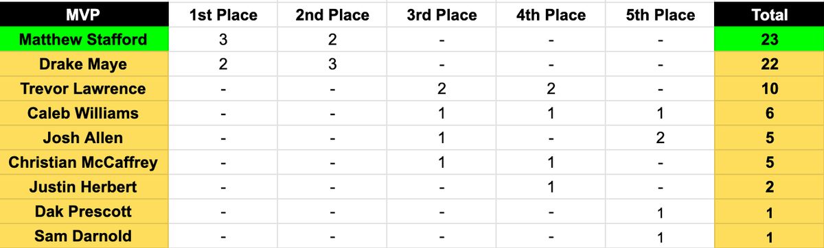 Just like you’d expect, the MVP race turned into an absolute dogfight between Matthew Stafford and Drake Maye. Not a single other player managed to snag a first- or second-place vote. In the end, Stafford’s absurd 46:8 TD-to-INT split was enough to earn him the nod. People will keep arguing about strength of schedule until they're blue in the face, but the truth is, both of these guys played well enough to take home the award.