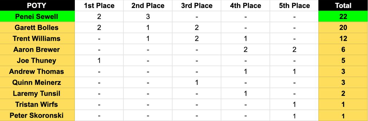 This season marks the debut of the NFL’s newest honor, the Protector of the Year award. For our staff, it was an incredibly tight race that eventually went to Penei Sewell, though it was far from a blowout. While three different linemen managed to snag a first-place vote, the final tally essentially turned into a two-man race between Sewell and Garett Bolles. In the end, Sewell’s dominance was just enough to edge out a victory.
