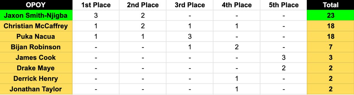 This was a fairly tight race with three players appearing on every ballot. In the end, Jaxon Smith-Njigba's nearly 1,800-yard season was enough to propel him to this award. Smith-Njigba led the NFL in receiving yards (17.93) and yards per touch (14.5) in 2025. Christian McCaffrey finished second in the voting and second in the NFL in yards from scrimmage (2,126). Puka Nacua led the NFL in receptions (129) and receiving yards (107.2) per game and came in third in the voting. Bijan Robinson came in fourth despite leading the NFL in yards from scrimmage (2,298).