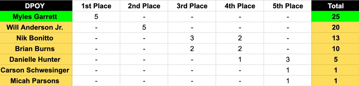 This one was a no-brainer. Breaking the single-season sack record is an automatic ticket to a unanimous NFL DPOY win, and Myles Garrett was simply in a league of his own. He’ll undoubtedly cruise to the award when the official results drop. Still, shout out to the guys who managed to make some noise behind him: Will Anderson Jr., Nik Bonitto, Brian Burns, and Danielle Hunter all earned well-deserved votes on at least four ballots.